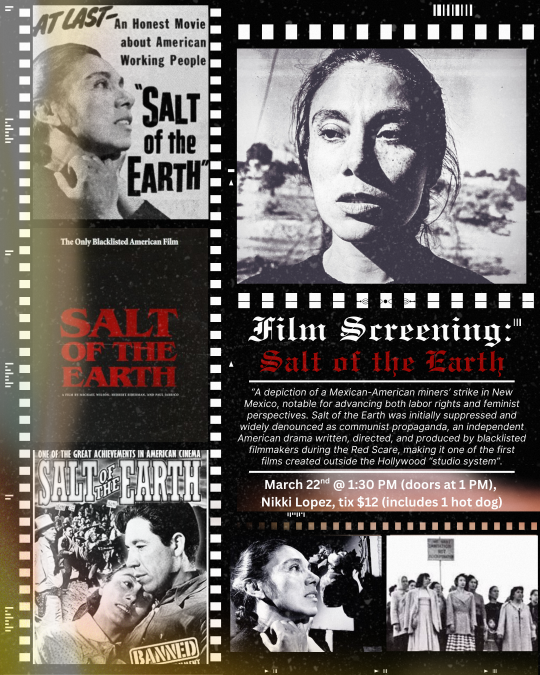 Join SPAC (South Philly Autonomous Cinema) and SPAC (South Philadelphia Action Coalition) for a matinee screening at Nikki Lopez on Sunday, 3/22 at 1:00 PM. We'll be screening Salt of the Earth, the landmark labor film. Tickets include a hot dog! All proceeds benefit the South Philly Action Coalition.