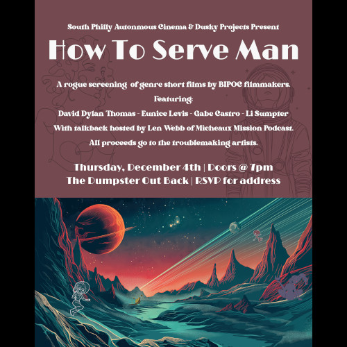 South Philly Autonomous Cinema and Dusky Projects present How To Serve Man: A rogue screening of genre short films by BIPOC filmmakers. Featuring David Dylan Thomas, Eunice Levis, Gabe Castro and Li Sumpter. With talkback hosted by Len Webb of Micheaux Mission Podcast. All proceeds go to the troublemaking artists. Masks optional and available at the door.