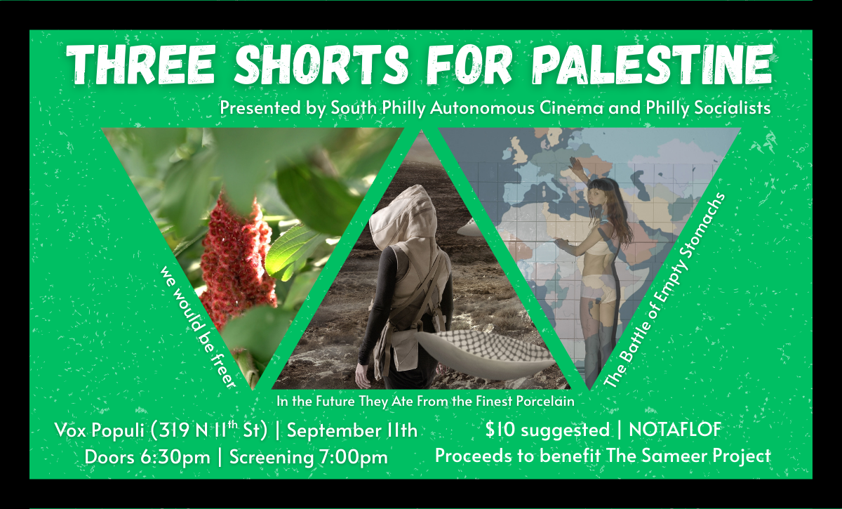 South Philly Autonomous Cinema and Philly Socialists continue their Palestine screening series with another evening of film, solidarity, and fundraising, this time with three recent short films exploring Palestinian struggle and liberation. The Battle of Empty Stomachs (2024, dir. Diana al-Halabi): Based on research and interviews with both Palestinian hunger strikers and asylum seekers, this absurdist yet realist film stages a dialogue between the director and her mother tongue that centers on a single question: what do we know about hunger? In the Future They Ate From the Finest Porcelain (2016, dir. Larissa Sansour and Søren Lind) resides in the cross-section between sci-fi, archaeology and politics. Combining live motion and CGI, the film explores the role of myth for history, fact and national identity. we would be freer (بنكون اكتر احرار) is a short film reflecting on the relationship between native plants and peoples living under settler-colonialism. Weaving between the voices of two women, one from the Mohawk community of Kahnawá:ke and the other an internally displaced refugee in Ramallah, we would be freer invites you to contemplate the role of the sumac plant in two occupied lands that lie far apart. Doors at 6:30 pm. This event is all ages. Masks are requested to be worn except when eating or drinking and will be supplied at the door.